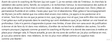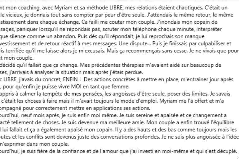 Quand je me suis décidée à suivre ce coaching, j'avais peur que ça ne me corresponde pas et d'être déçue d'avoir investi dedans mais c'est tout le contraire. Je recommande à 2000%, je ne regrette qu'une chose : ne pas l'avoir fait avant. Myriam est une personne à l'écoute, très agréable, enthousiaste elle sait me remotiver si besoin, disponible facilement elle répond à mes questions très rapidement grâce au suivi sur whatsapp ce qui me permet d'avancer sereinement sur les exercices donnés. Myriam a créé un coaching avec des exercices bien précis, très ciblés. Le travail donné est un trousseau de clés, à chacun de s'en saisir et d'ouvrir ses portes avec. Myriam m'a accompagnée à chacune de mes portes, elle m'a aidée à ouvrir les plus récalcitrantes. Résultats, mon entourage a vu des changements notables (même certains personnes qui ne savaient pas que je suivais ce coaching). Avant de commencer, ma situation personnelle et professionnelle n'était pas satisfaisante ni épanouissante. J'étais à bout de nerfs, stressée, épuisée. Je me suis faite accompagner par un psychologue mais ce n'était pas suffisant. J'ai trouvé ici un accompagnement avec des exercices concrets qui m'ont permis d'avancer beaucoup plus vite sur mon épanouissement personnel. On me trouve plus calme (et moi aussi je le vois), plus souriante et plus disponible. Les premiers résultats n'ont pas attendus dès le 1er exercice, j'ai réussi à avancer sur la gestion de mes émotions. J'arrive à m'épanouir enfin Merci Myriam.