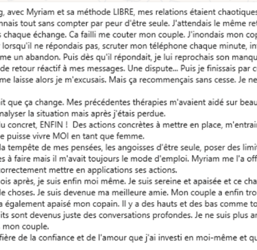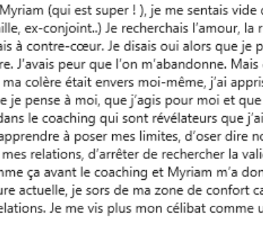 Avant je subissais mes émotions et je survivais. Myriam m'a aidé pendant les 3 mois d'accompagnement, m'a guidé et m'a réconcilié avec mes émotions . J'ai appris à me reconnecter à mes ressentis. J'ai appris et j'apprends encore a être pleinement moi mais aussi a être ma meilleure amie. Le chemin sera pas toujours facile mais grâce à ce coaching je peux traverser le chemin peu importe l'obstacle sur ma route.
