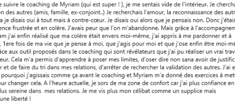 Grâce à son programme, j’ai pu mieux me comprendre et apprendre à gérer les situations problématiques du quotidien. Mon expérience avec Myriam à vraiment été très positive. Merci à toi pour tes conseils et ton investissement. Je recommande vivement son programme de coaching ❤️❤️