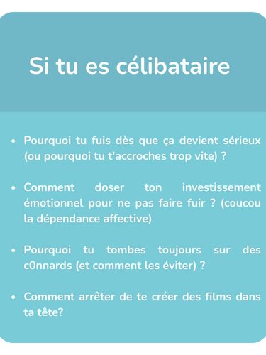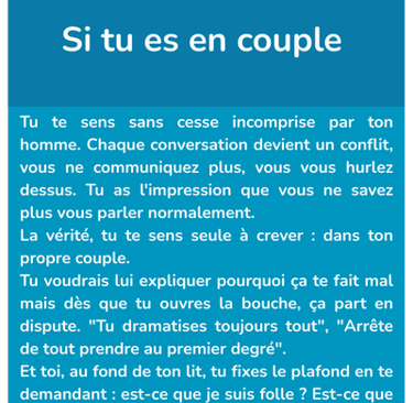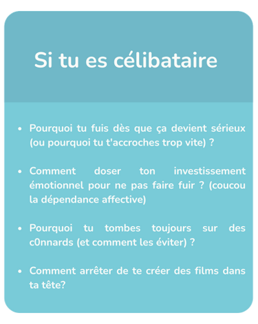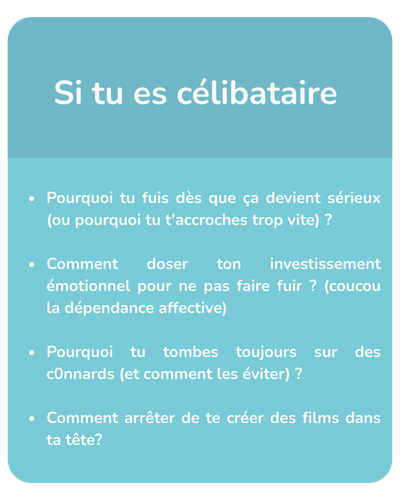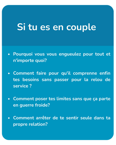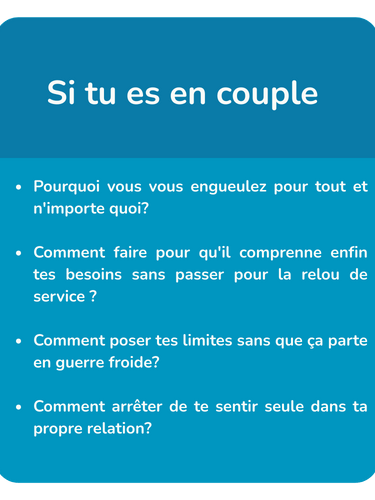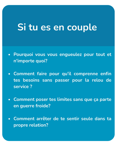 Si tu es en couple, on analyse pourquoi vous vous prenez la tête en permanence, pourquoi tu te sens incomprise, ou pourquoi tu donnes tout sans rien recevoir en retour.
