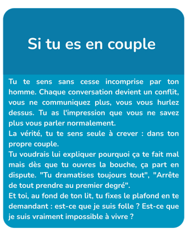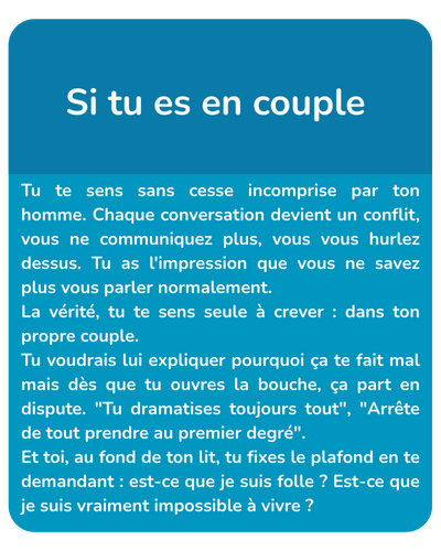 Si tu es en couple, on comprend pourquoi tu exploses quand il te dit "tu dramatises", pourquoi tu te sens seule même à deux, pourquoi chaque oubli de sa part devient un drame.