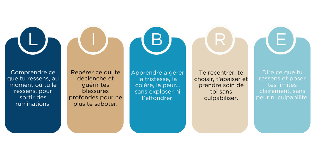 Découvre la méthode LIBRE, exprime tes émotions sans exploser, affirme-toi sans t'excuser et construis des relations saines sans te perdre et sans passer 10 ans en thérapie